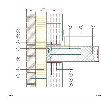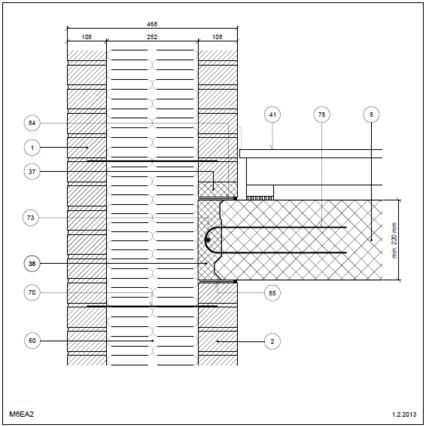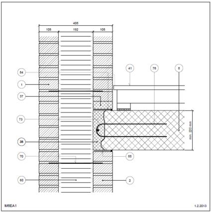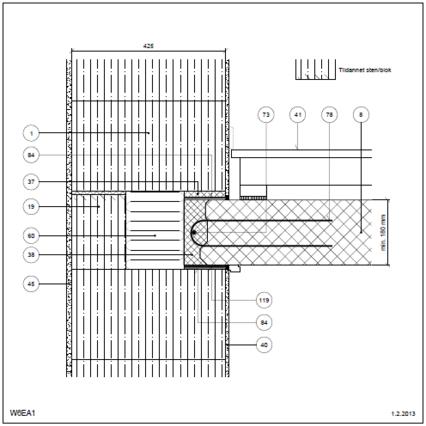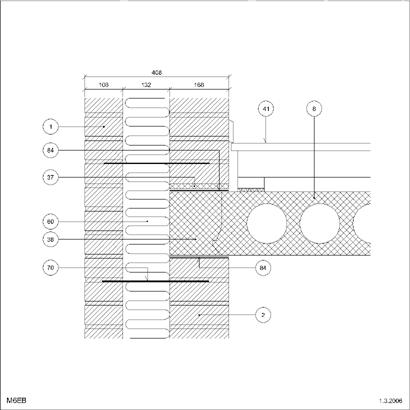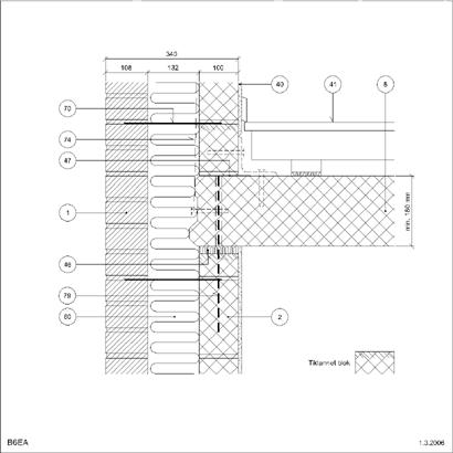 Bagmur: Højisolerende tegl Letklinkerdæk Isolerende teglblokke i bagmur Etageadskillelse (lodret snit) Letklinkerdæk Rækkehus. Fri kant Kombinationsvæg, 415 mm U-værdier U,l: 0.22