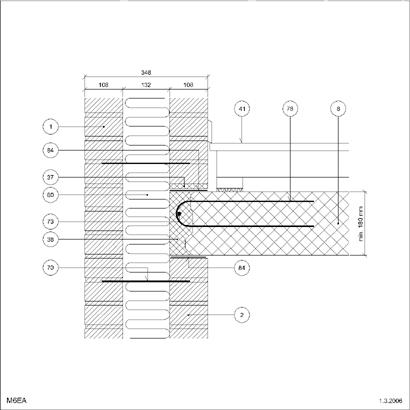 Bagmur: Tegl Saml. ved dæk og tegloverl. Etageadskillelse (lodret snit) Samling ved betondæk og tegloverligger Tegl i bagmur Etagehus. Fri kant Hulmur, 348 mm U-værdier U,l: 0.26