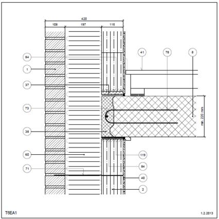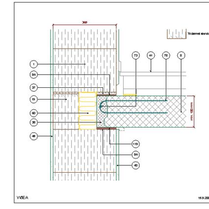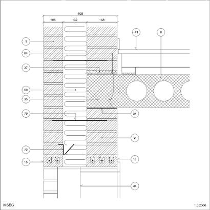Bagmur: Højisolerende tegl Letklinkerdæk Isolerende teglblokke i bagmur Etageadskillelse (lodret snit) Letklinkerdæk Rækkehus. Fri kant Kombinationsvæg, 420 mm U-værdier U,l: 0.18