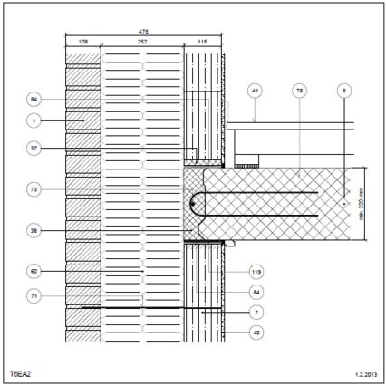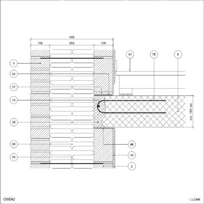 Bagmur: Højisolerende tegl Letklinkerdæk Rækkehus. Fri kant Letklinkerdæk Etageadskillelse (lodret snit) Isolerende teglblokke i bagmur Kombinationsvæg, 475 mm U-værdier U,l: 0.13