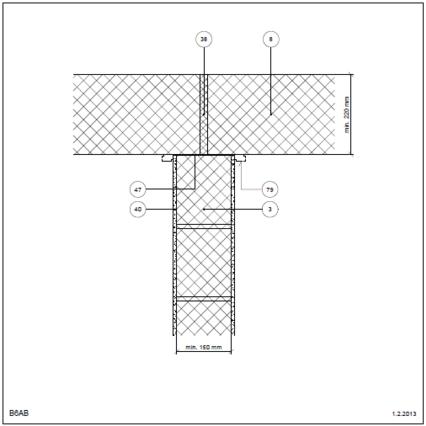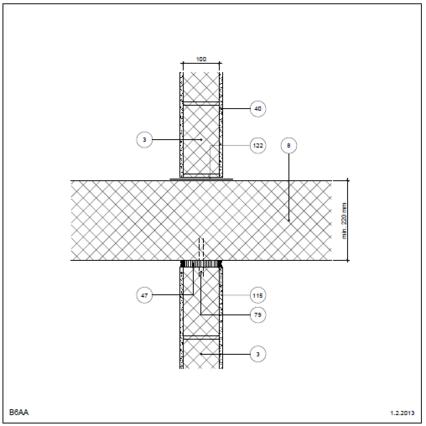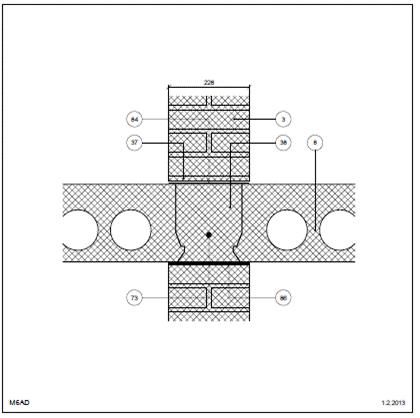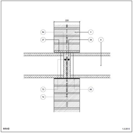 Bagmur: Tegl Kraftoverførende Etageadskillelse (lodret snit) Indvendig. Etagehus Betondæk, bærende kant Tegl i skillevæg Kraftoverførende med neutral zone