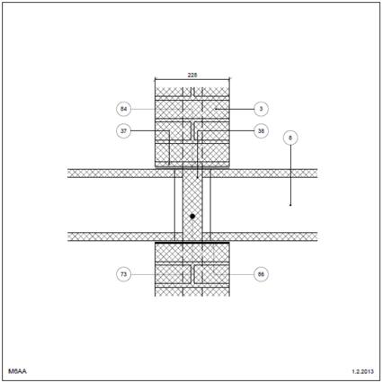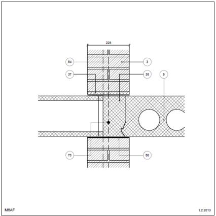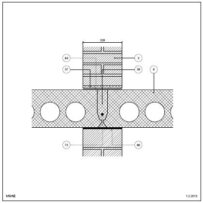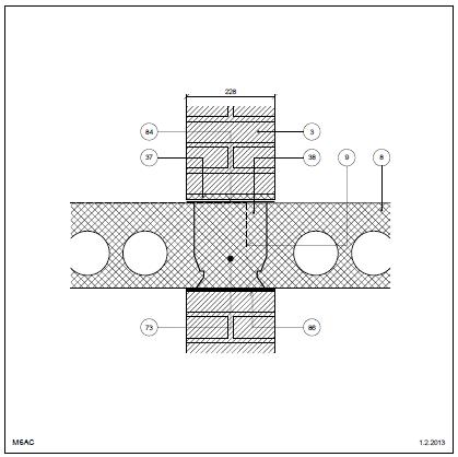 Bagmur: Tegl Dækkant u. neutral zone Etageadskillelse (lodret snit) Betondæk, fri kant Indvendig. Etagehus Tegl i skillevæg Dækkant uden neutral zone