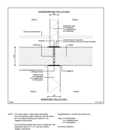Bagmur: Tegl Etageadskillelse (lodret snit) Kraftoverførende Tegl i skillevæg Indvendig. Etagehus Betondæk, bærende kant Kraftoverførende uden neutral zone