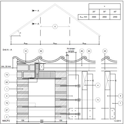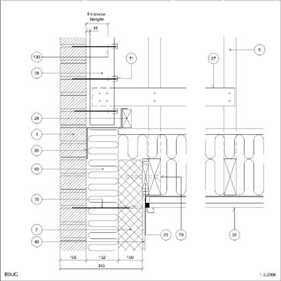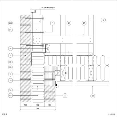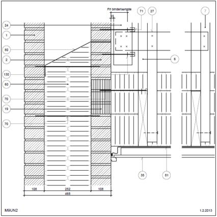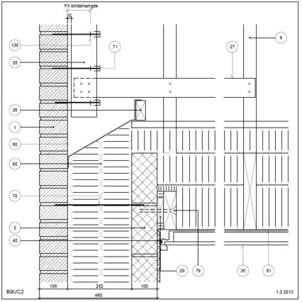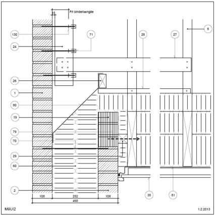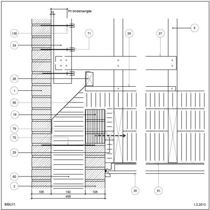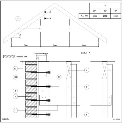 Bagmur: Letklinkerblokke Gavl (lodret snit) Snit vink. på gavltr., skrå tag Forankring af ½-stens gavltrekant Snit vinkelret på gavltrekant, skrå tag Kombinationsvæg, 340 mm Udvendig