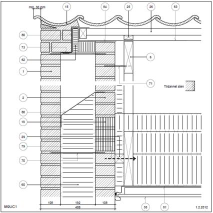 Bagmur: Tegl Hulmur, 408 mm Udvendig Gavl (lodret snit) Hulmur, 408 mm Tag med udhæng, gesims, 45° gitterspær U-værdier U,l: 0.19 U,v: 0.14