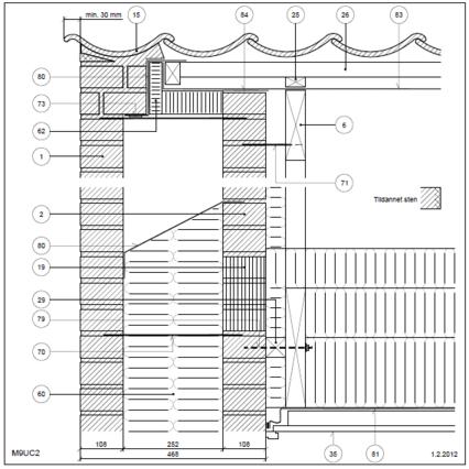 Bagmur: Tegl Tag med udhæng, 25° gitterspær Hulmur, 468 mm Gavl (lodret snit) Udvendig
