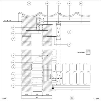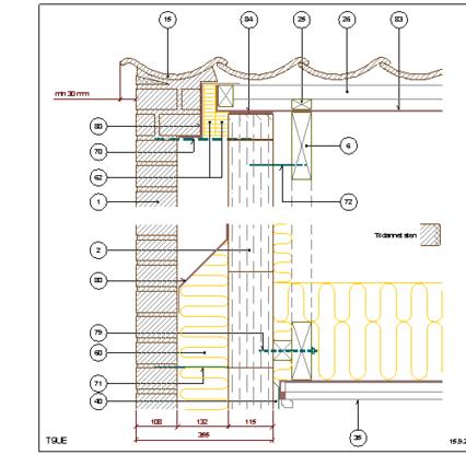 Bagmur: Tegl Tag m. udhæng, 25° g.spær Tag med udhæng, 25° gitterspær Hulmur, 348 mm Gavl (lodret snit) Udvendig U-værdier U,l: 0.27 U,v: 0.14