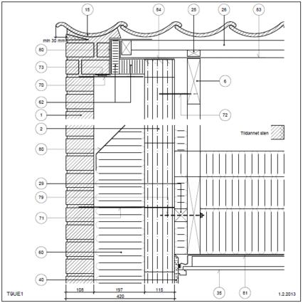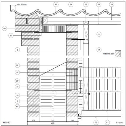 Bagmur: Højisolerende tegl Gavl u. udhæng, 25° g.spær Isolerende teglblokke i bagmur Gavl (lodret snit) Tag uden udhæng, 25° gitterspær Udvendig Kombinationsvæg, 355 mm U-værdier U,l: 0.24 U,v: 0.14