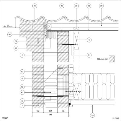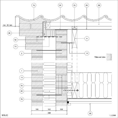 Bagmur: Tegl Udhæng, gesims, 25° g.spær Tag med udhæng, gesims, 25° gitterspær Hulmur, 348 mm Gavl (lodret snit) Udvendig U-værdier U,l: 0.27 U,v: 0.14