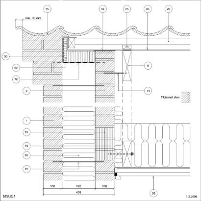 Bagmur: Højisolerende tegl Udvendig Tag uden udhæng, 25° gitterspær Gavl (lodret snit) Isolerende teglblokke i bagmur Kombinationsvæg, 420 mm
