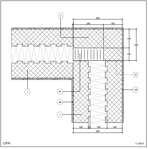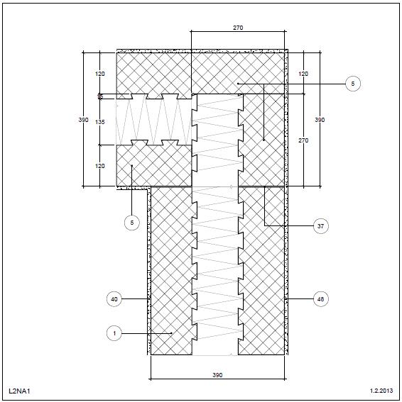 Bagmur: Leca Termblokke Hjørneløsning med tilskåret blok Hjørne med tilpasning, ydermur Ydervæg: Leca Termblokke 390 mm U-værdier U,l: 0.2