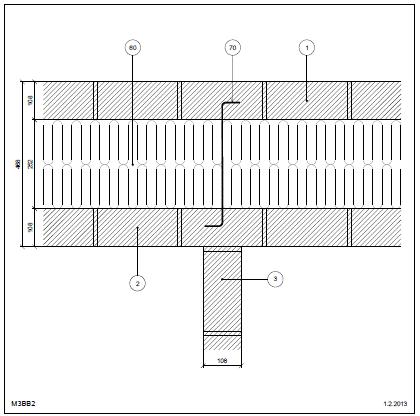 Bagmur: Tegl Lodret skel (opstalt) Hulmur, 468 mm Skillevæg I bygning Tegl i skillevæg Hulmur, 468 mm U-værdier U,l: 0.14