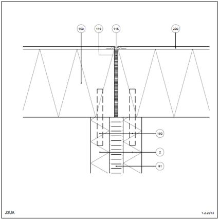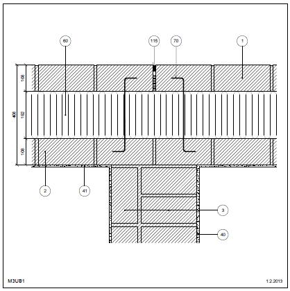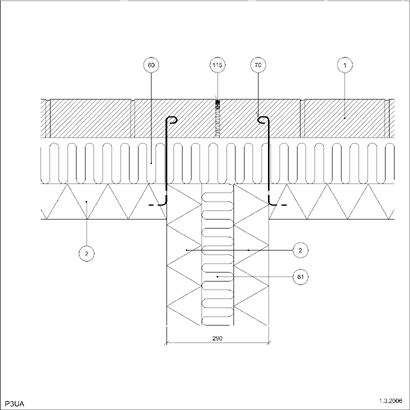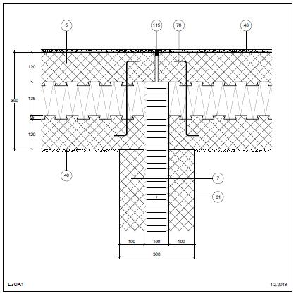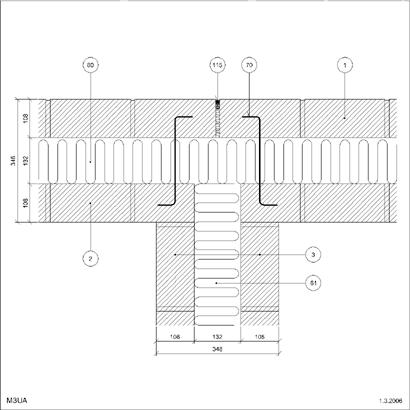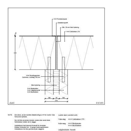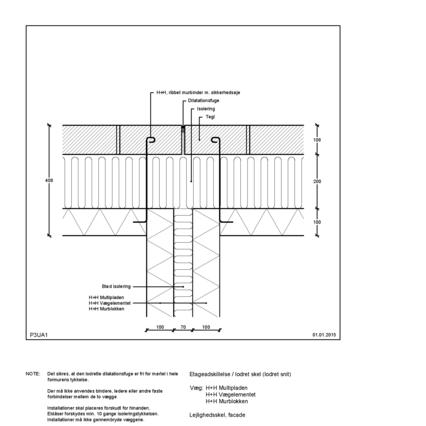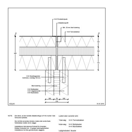 Bagmur: Monomur, porebeton Denne tegning har U-værdier, som ikke anbefales i nybyggeri. Detaljen vises, fordi den angiver en teknisk løsning, som ikke findes på andre detaljer Rækkehuse Lodret skel (vandret snit) Rækkehuse Etagebyggeri Porebeton Lejlighedsskel Dobbeltvægge med isolering