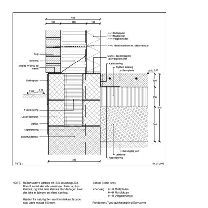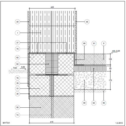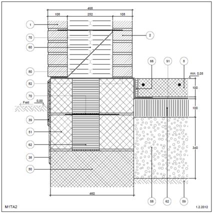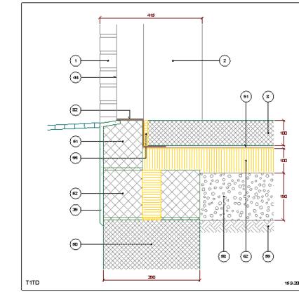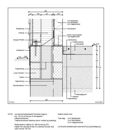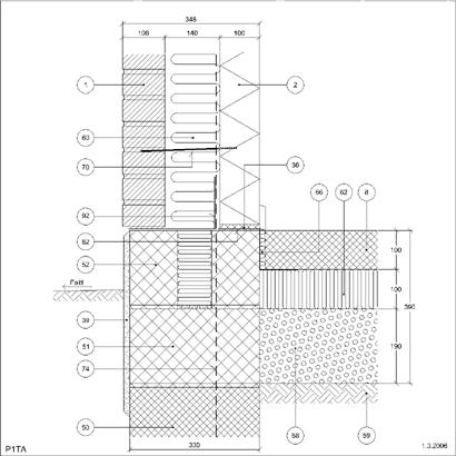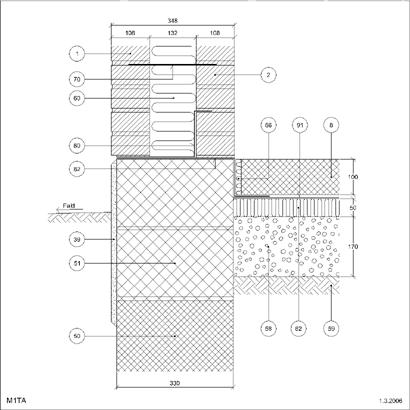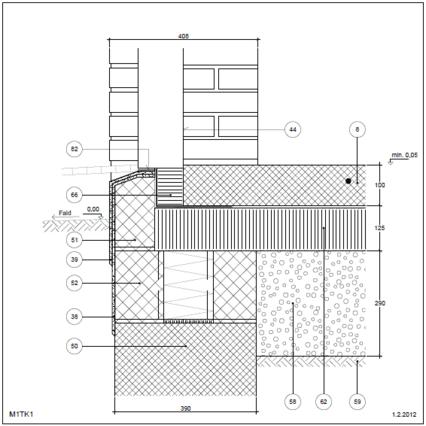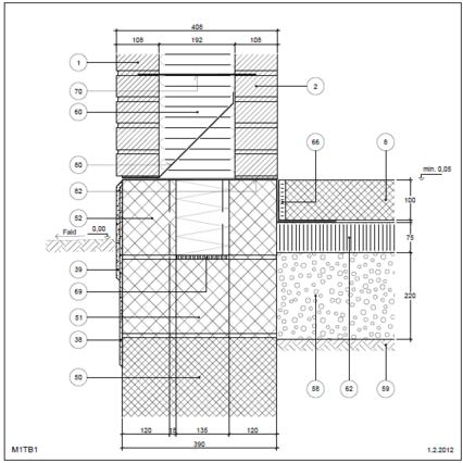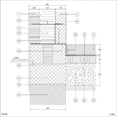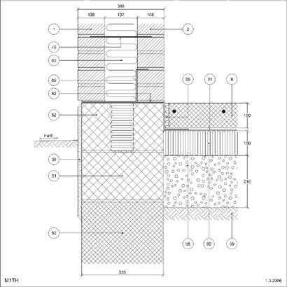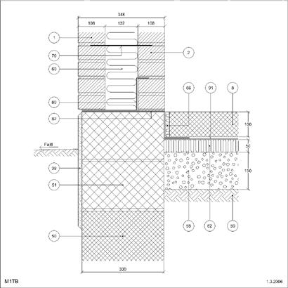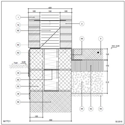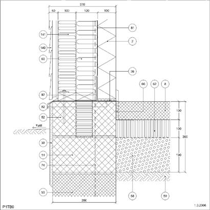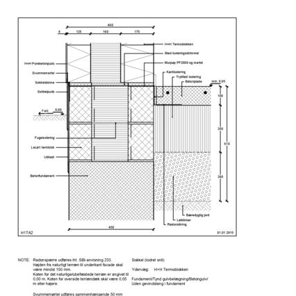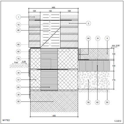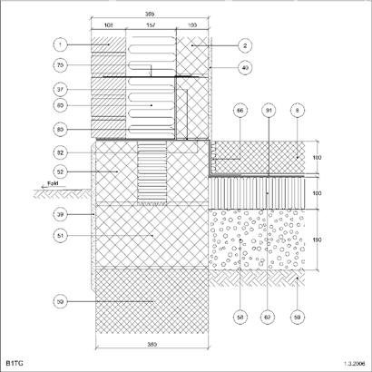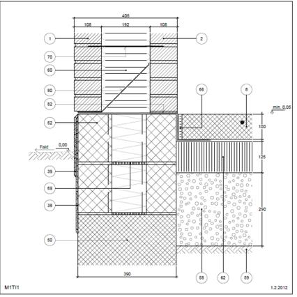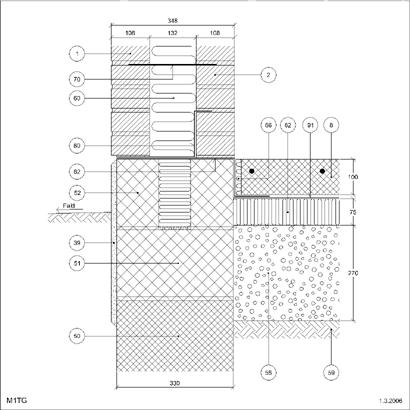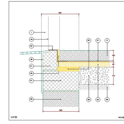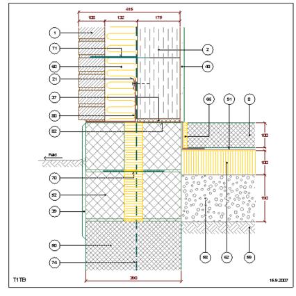 Bagmur: Monomur, tegl Letklinkerblokke, 350 mm Monomur Sokkel (lodret snit) Term-blokke. Letklinkerblokke, 350 mm Blokke/tynd gulvbelægning Trykfast isolering, 50 mm. Monomur, 365 mm, T10 Letklinker, 170 mm