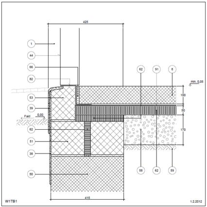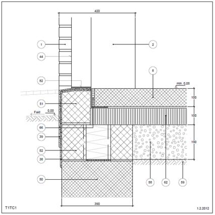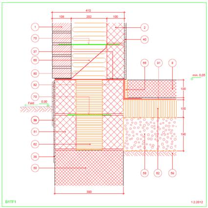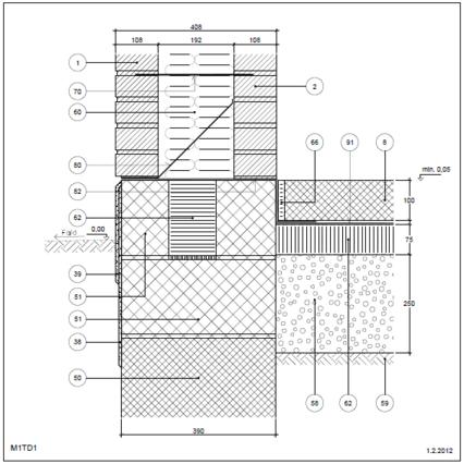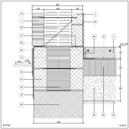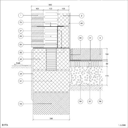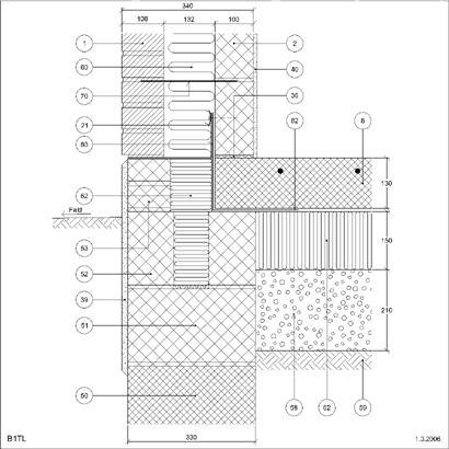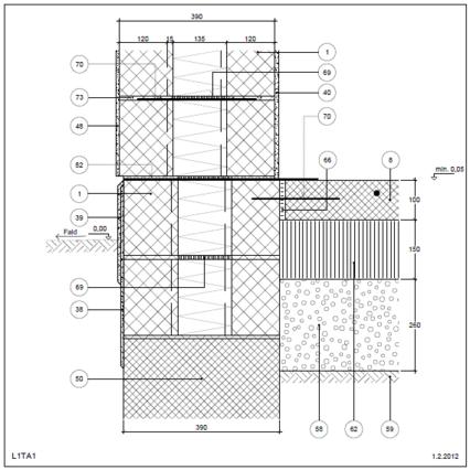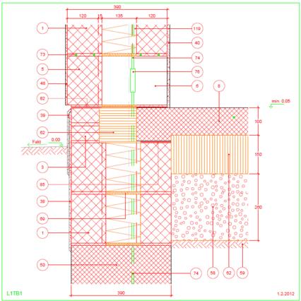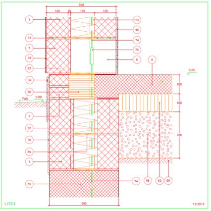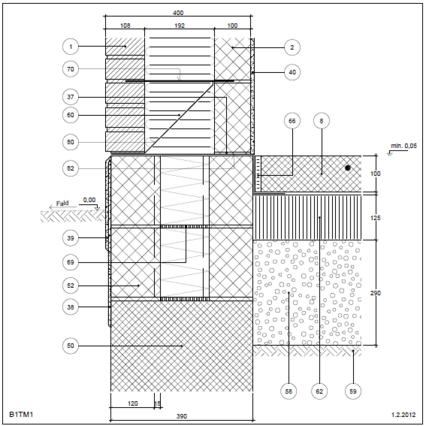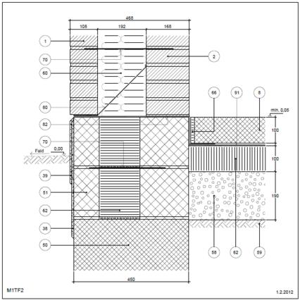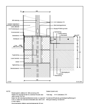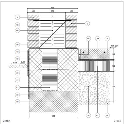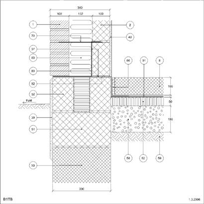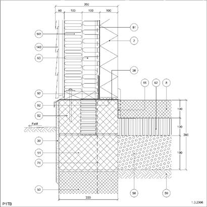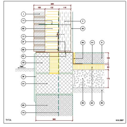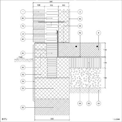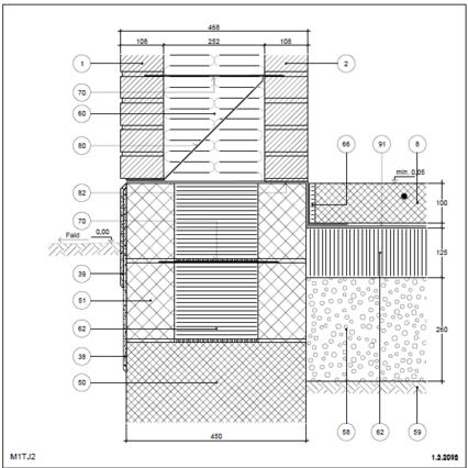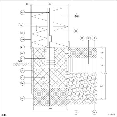 Bagmur: Monomur, tegl Letklinkerblokke, 350 mm Monomur Sokkel (lodret snit) Term-blokke. Letklinkerblokke, 350 mm Blokke/tynd gulvbelægning Trykfast isolering, 50 mm. Monomur, 365 mm, T10 Letklinker, 170 mm