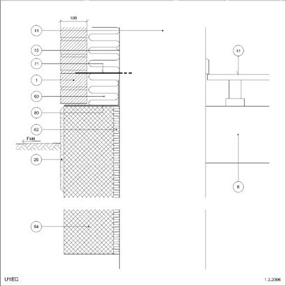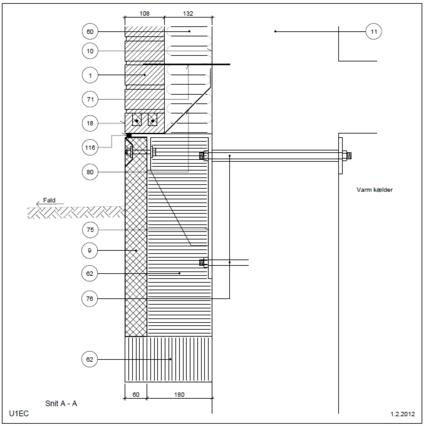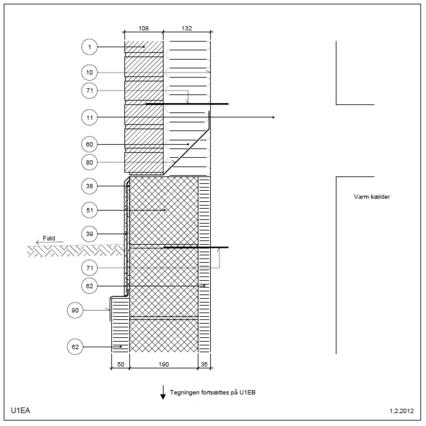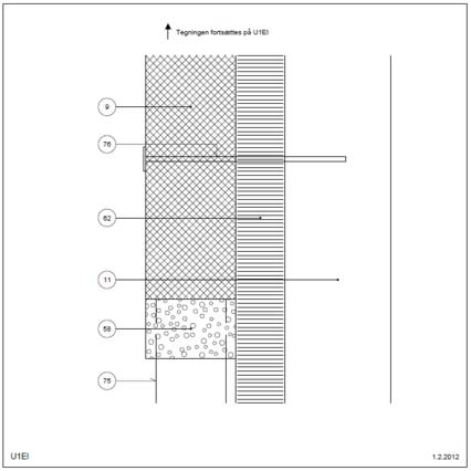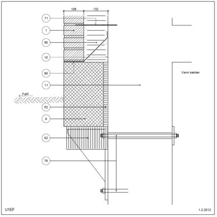 Bagmur: Betonbj. bund Betonbjælke af elementer, nederste del af tegning Varm kælder Efterisolering Sokkel (lodret snit) U-værdier U,l: ikke oplyst kuldebro (1): ikke oplyst