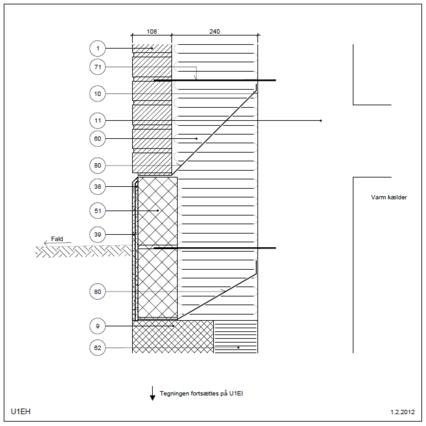 Bagmur: Betonbjælke på minipæle. bund Sokkel (lodret snit) Efterisolering Varm kælder Betonbjælke på minipæle, nederste del af tegning U1EH