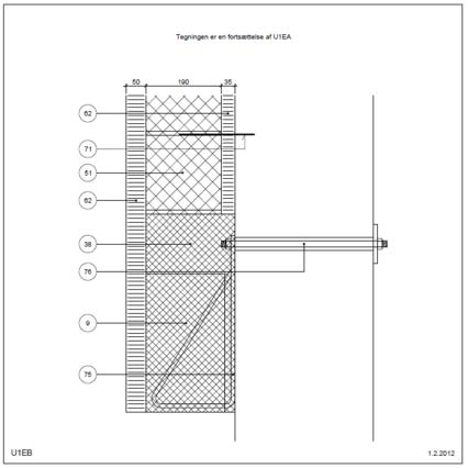 Bagmur: Stålkonsoller Betonbjælke, oplagt på stålkonsoller Varm kælder Efterisolering Sokkel (lodret snit) U-værdier U,l: ikke oplyst kuldebro (1): ikke oplyst