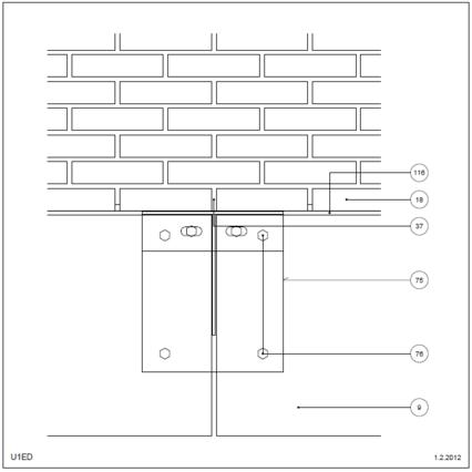 Bagmur: Præfab. tegloverl. Sokkel (lodret snit) Efterisolering Varm kælder Teglbjælke med præfab. tegloverligger Oplagt på stålkonsoller U-værdier U,l: ikke oplyst kuldebro (1): ikke oplyst