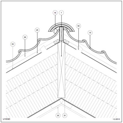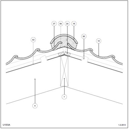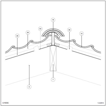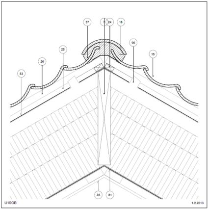 Bagmur: Grat Tag (lodret snit) Mørtelfri, 25° taghældning