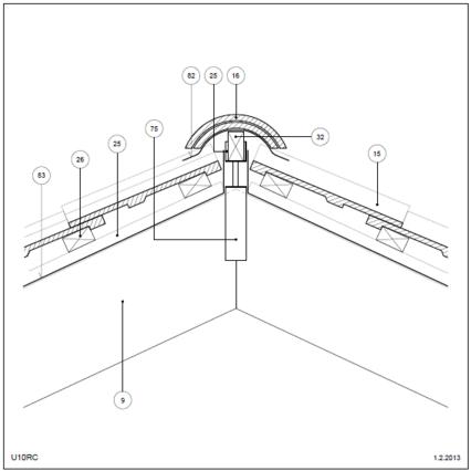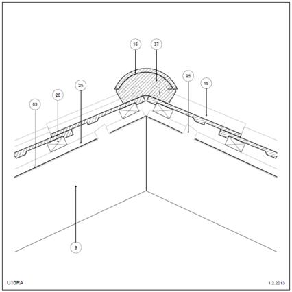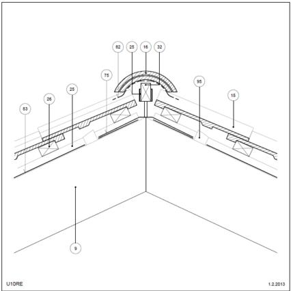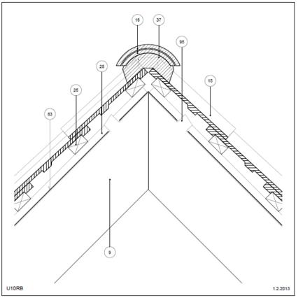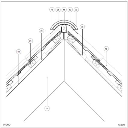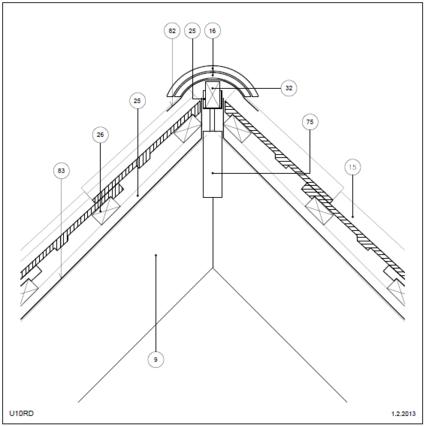 Bagmur: Mørtelfri, 25° taghæld. Rygning Tag (lodret snit) Ventileret rygning