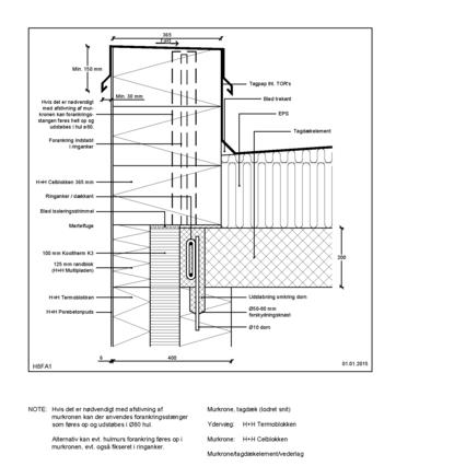 Bagmur: H+H Termoblokken Tilslutning (lodret snit) Elementdæk Murkrone/Tagfod (fladt tag) Ydervæg, H+H termoblokken 400 mm Murkrone, H+H Celblokken 360 mm