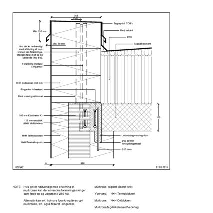 Bagmur: H+H Termoblokken Tilslutning (lodret snit) Elementdæk Murkrone/Tagfod (fladt tag) Ydervæg, H+H termoblokken 460 mm Murkrone, H+H Celblokken 360 mm