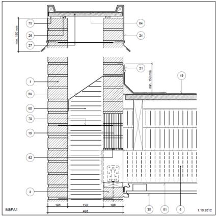 Bagmur: Tegl Tilslutning (lodret snit) Træbjælkelag Tagfod (fladt tag) Tegl i bagmur Hulmur, 408 mm