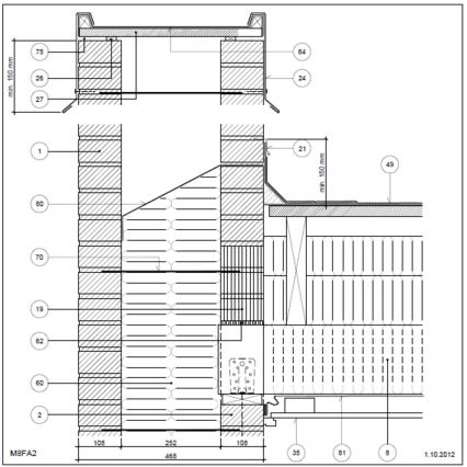 Bagmur: Tegl Tilslutning (lodret snit) Træbjælkelag Tagfod (fladt tag) Tegl i bagmur Hulmur, 468 mm