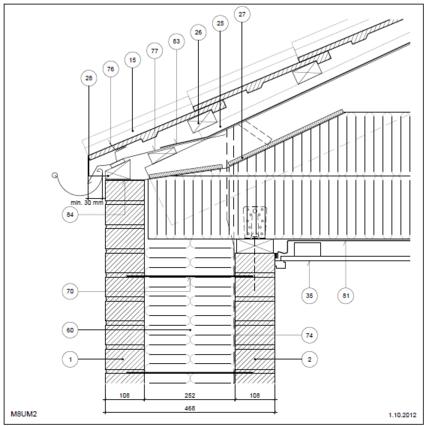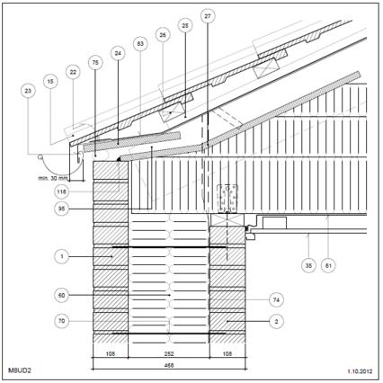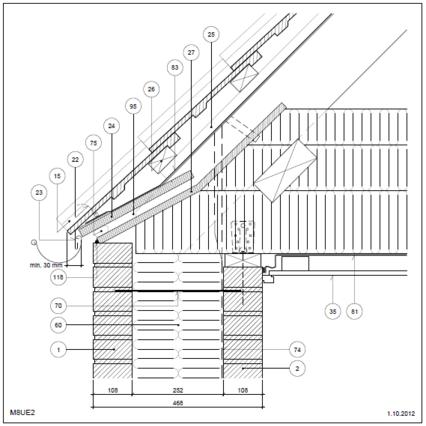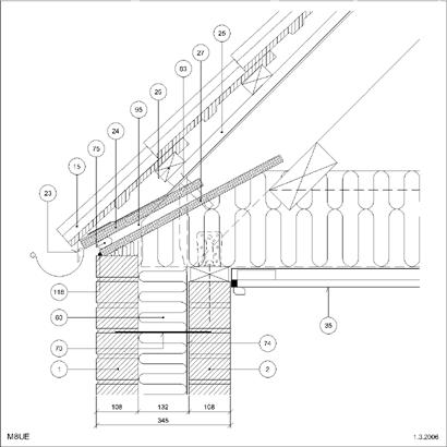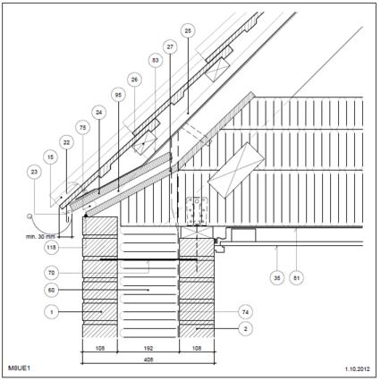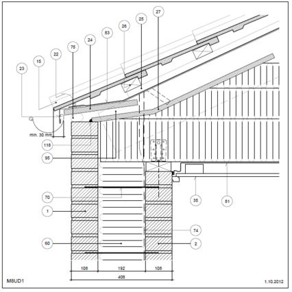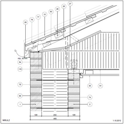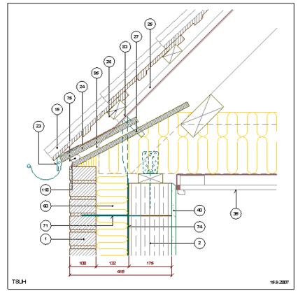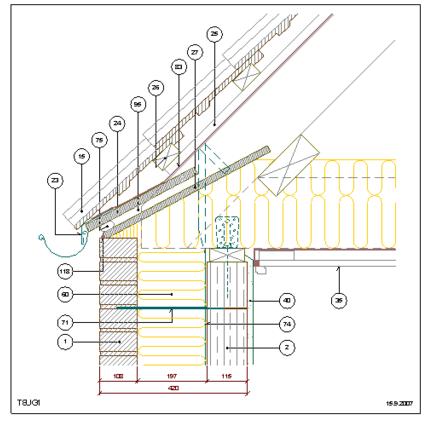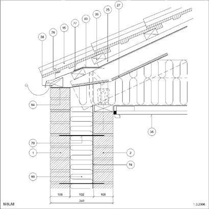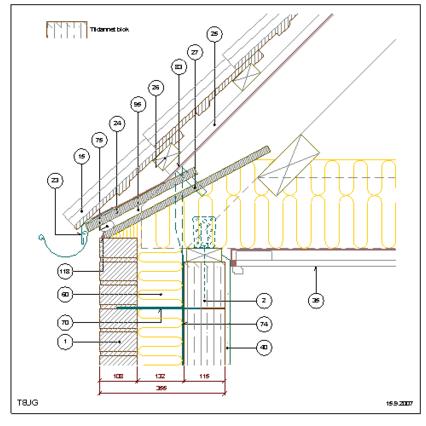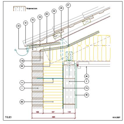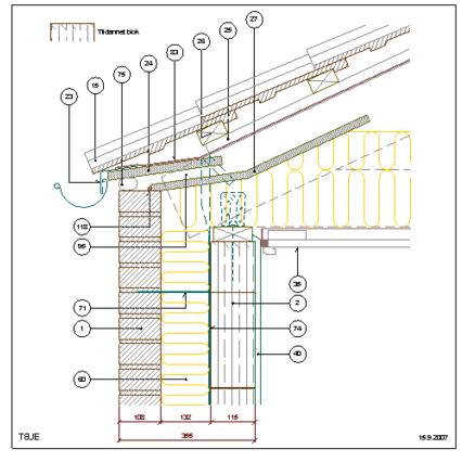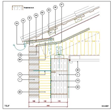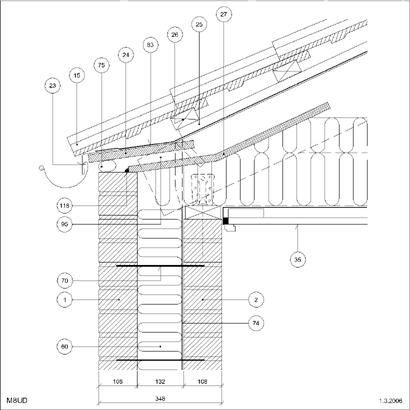 Bagmur: Tegl Tag u. udhæng, 25° g.spær Tegl i bagmur Tagfod (lodret snit) Udvendig. Gitter- og hanebåndsspær Tag uden udhæng, 25° gitterspær Undertag, banevare Hulmur, 348 mm