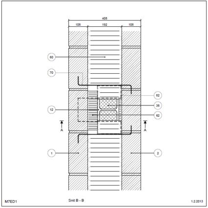 Bagmur: Tegl Tilslutning (lodret snit) Søjle Stålsøjle II, snit B – B Tegl i bagmur Hulmur, 408 mm U-værdier U,l: ikke oplyst kuldebro (1): ikke oplyst
