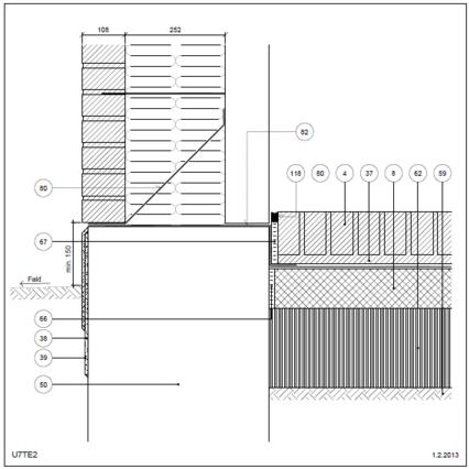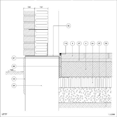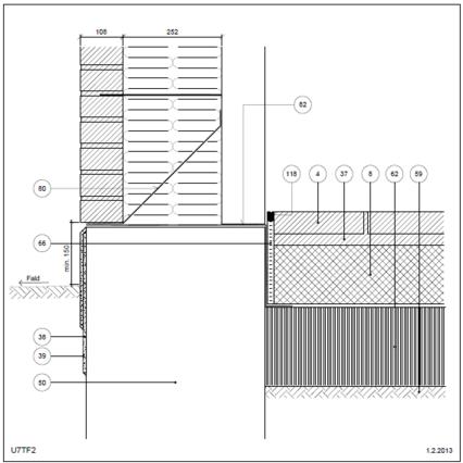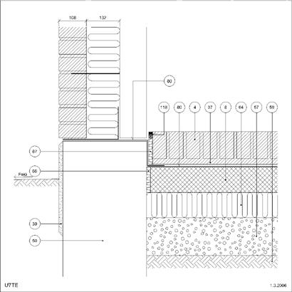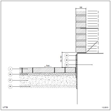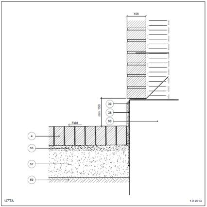 Bagmur: Teglgulv Tilslutning (lodret snit) Let last Udendørsbelægninger Sten på kant med ca. 12 mm fuge U-værdier U,v: 0.14