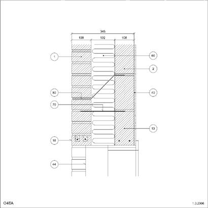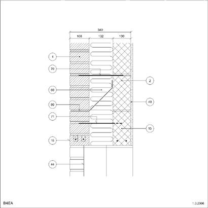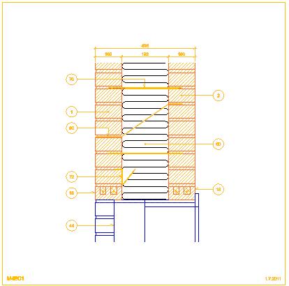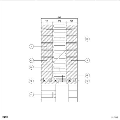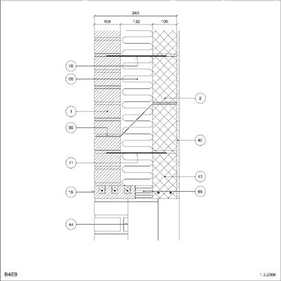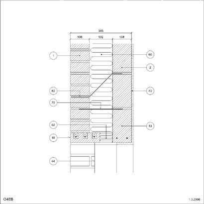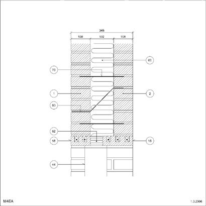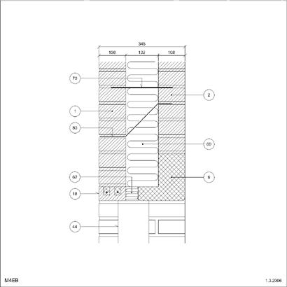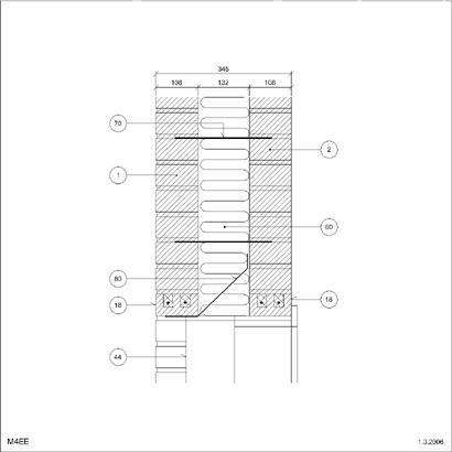 Bagmur: Teglblokke Teglblokke i bagmur Vindue (lodret snit) Øvre fals. Med TB-rende og pap Teglbjælke i for- og bagmur Hulmur, 468 mm U-værdier U,l: 0.13 kuldebro (1): 0.13