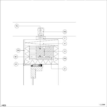 Bagmur: Tegl Vindue (lodret snit) Tegloverligger (b = 2 x 108 mm), ubrudt teglbjælke Tegl i bagmur Øvre fals. Med 2 gange pap Hulmur, 468 mm U-værdier U,l: 0.14 kuldebro (1): 0.14