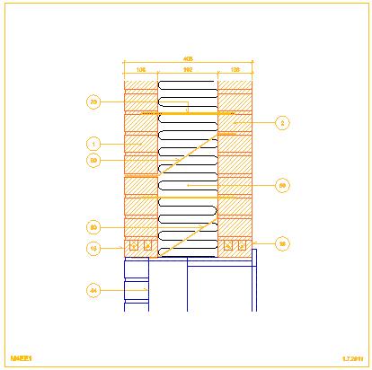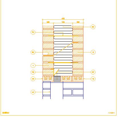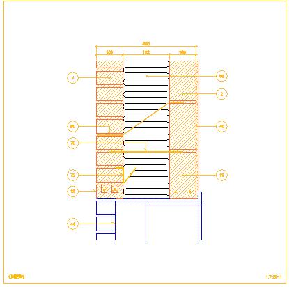 Bagmur: Teglblokke Teglbjælke i for- og bagmur Øvre fals. Med TB-rende og pap Vindue (lodret snit) Teglblokke i bagmur Hulmur, 408 mm U-værdier U,l: 0.17 kuldebro (1): 0.17