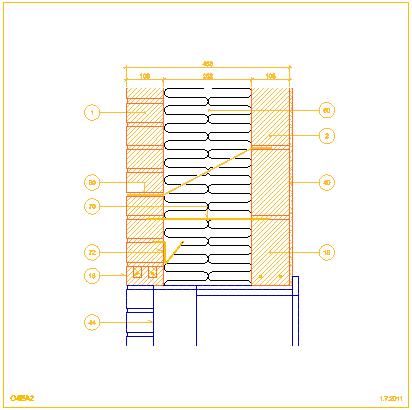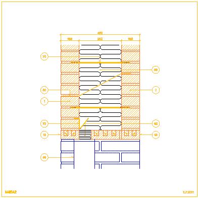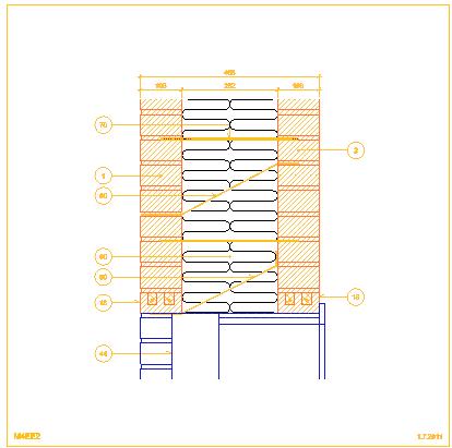 Bagmur: Teglblokke Tegloverl. (168 mm) i formur Tegloverligger (b = 168 mm) i formur. Teglbjælke i bagmur Øvre fals. Med pap Vindue (lodret snit) Teglblokke i bagmur Hulmur, 348 mm U-værdier U,l: 0.27 kuldebro (1): 0.51