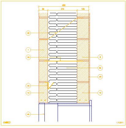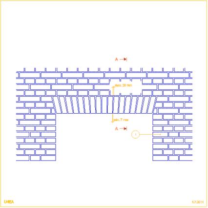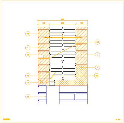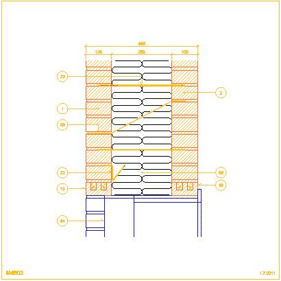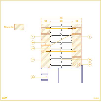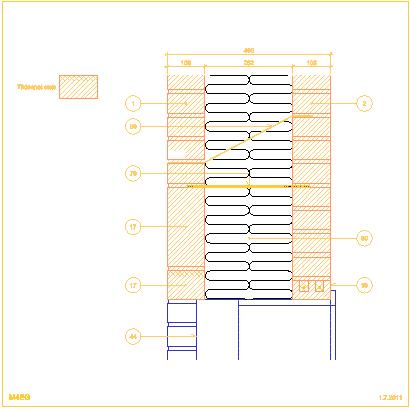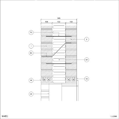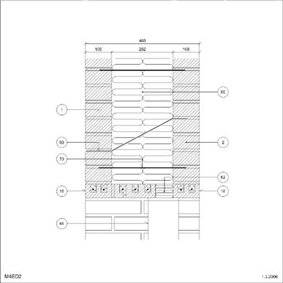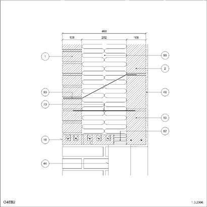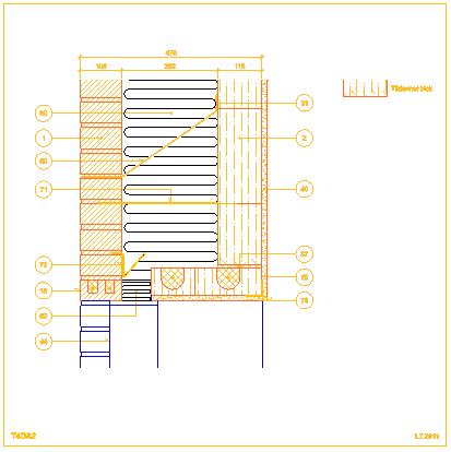 Bagmur: Teglblokke Teglblokke i bagmur Vindue (lodret snit) Øvre fals. Med TB-rende og pap Tegloverligger (b = 108 mm) i formur. Teglbjælke i bagmur Hulmur, 468 mm U-værdier U,l: 0.14 kuldebro (1): 0.14