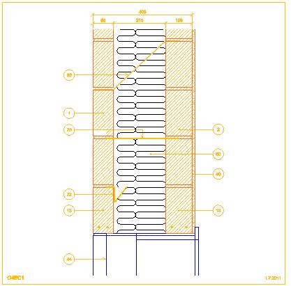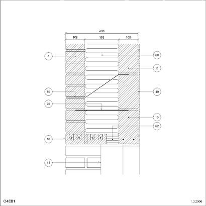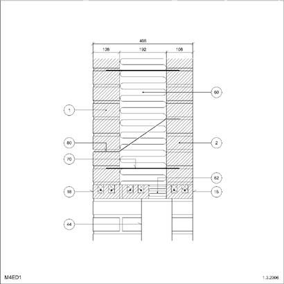 Bagmur: Teglblokke Tegloverligger (b = 108 mm) i formur. Teglbjælke i bagmur Øvre fals. Med TB-rende og pap Vindue (lodret snit) Teglblokke i bagmur Hulmur, 408 mm U-værdier U,l: 0.19 kuldebro (1): 0.19
