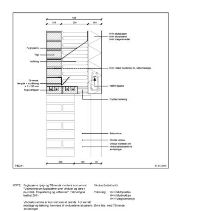 Bagmur: Tegl Vindue (lodret snit) Øvre fals. Med TB-rende og pap Tegl i bagmur Tegloverligger (b = 2 x 108 mm) Hulmur, 408 mm U-værdier U,l: 0.19 kuldebro (1): 0.19